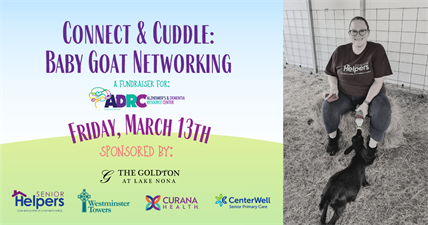 The Alzheimer's & Dementia Resource Center (ADRC) invites local professionals and community partners to a one-of-a-kind networking event designed to bring people together in a warm and welcoming atmosphere. Enjoy meaningful conversation, community engagement, and the added delight of spending time with friendly baby goats.