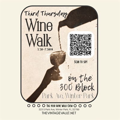 Join us each month for our Third Thursday Wine Walk on Park Avenue—an elevated evening of sipping, strolling, and discovering the best of Winter Park.